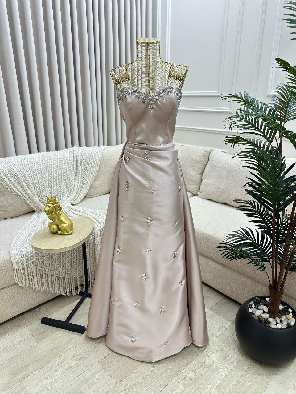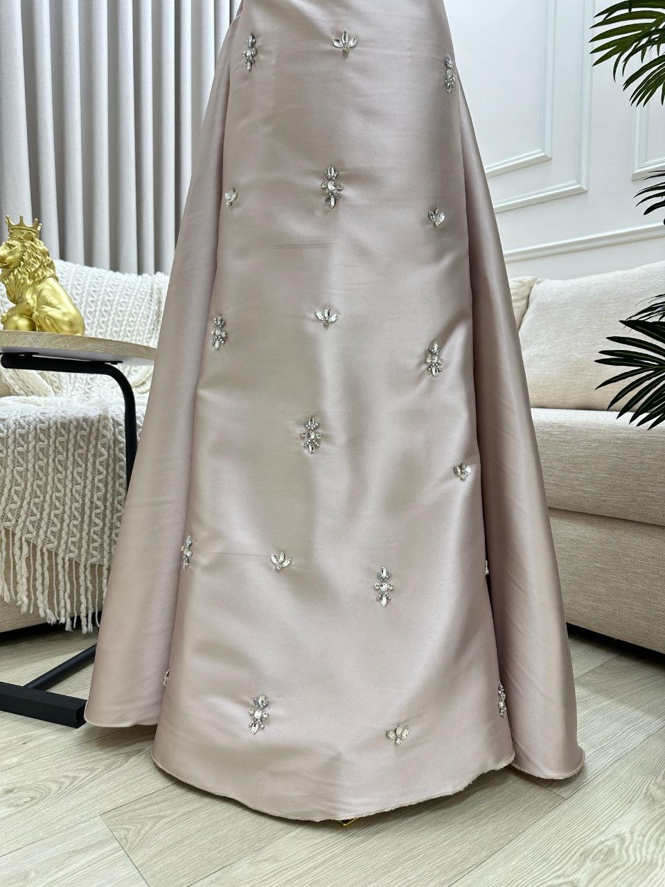 الوصف: تصميم فريد من نوعه يبرز جمال القوام ويزيد من تألقك. الفستان مزين بتطريزات كريستالية على الصدر، وقماش الدانتيل الأنيق يضفي عليه لمسة من الرقي. هذا الفستان مثالي لكل امرأة تبحث عن إطلالة ملكية ومميزة.